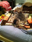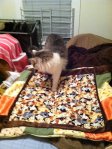 Since the machine was already loaded with the brown thread, I decided to quickly finish up the Cat Quilt. I got it finished and put it on the bed for Desmond to inspect: