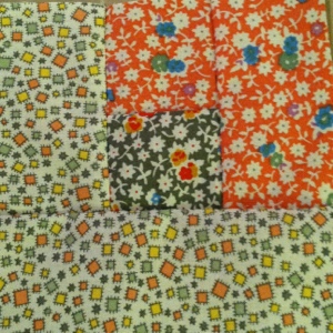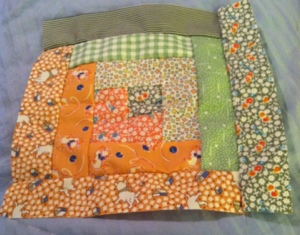 I’ve been working on the quilt in stages, adding each section of fabric to the remaining 11 blocks, on piece at a time. Here is the block with four pieces: